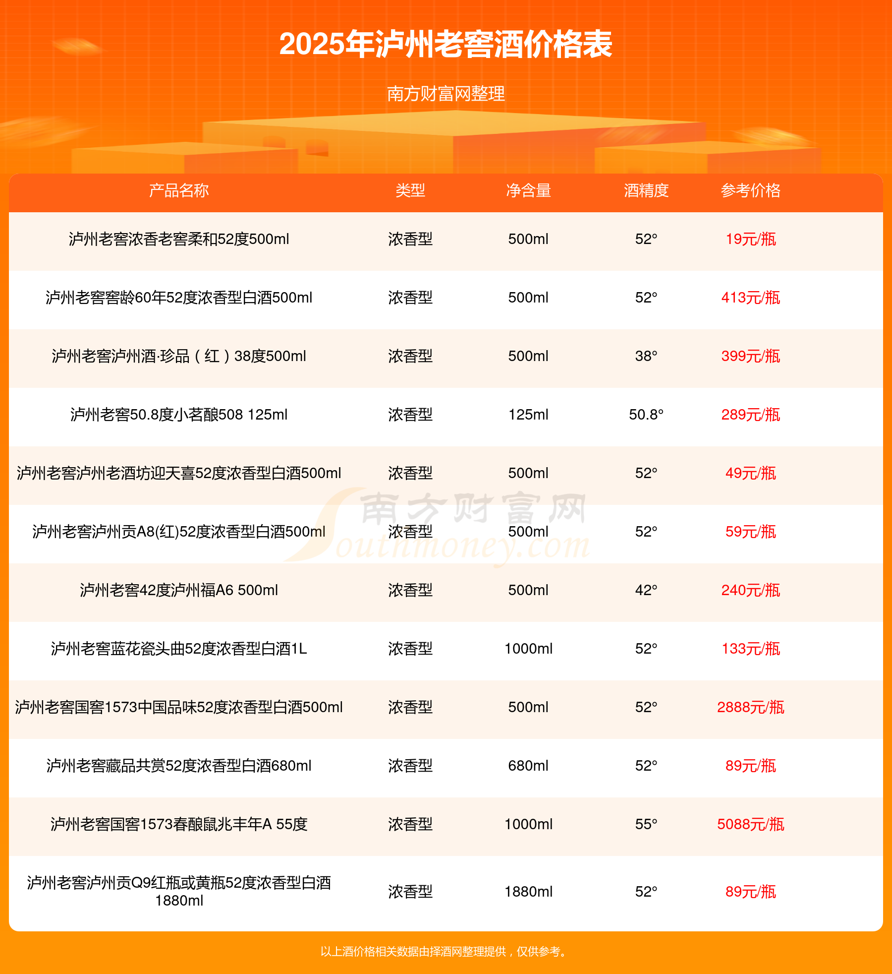 2025瀘州老窖酒最新價(jià)格:瀘州老窖國(guó)窖1573春釀鼠兆豐年E 55度參考價(jià)17999元/瓶、瀘州老窖國(guó)窖1573生命中的那壇酒55度014參考價(jià)9999元/瓶、瀘州老窖國(guó)窖1573春釀鼠兆豐年A 55度參考價(jià)5088元/瓶、瀘州老窖國(guó)窖1573生命中的那壇酒55度013濃香型白酒1000ml參考價(jià)4988元/瓶、瀘州老窖國(guó)窖1573生命中的那壇酒55度009 1000ml參考價(jià)4288元/瓶。