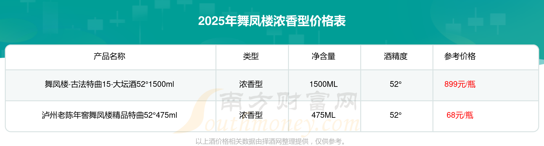 2025年舞鳳樓濃香型酒舞鳳樓·古法特曲15·大壇酒52°1500ml、瀘州老陳年窖舞鳳樓精品特曲52°475ml等最新價格如下:舞鳳樓·古法特曲15·大壇酒52°1500ml參考價899元/瓶、瀘州老陳年窖舞鳳樓精品特曲52°475ml參考價68元/瓶。
