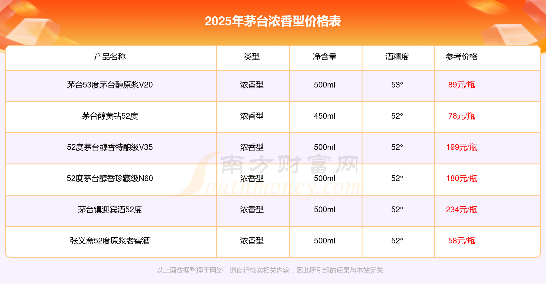 2025年茅臺(tái)濃香型酒茅臺(tái)鎮(zhèn)迎賓酒52度、52度茅臺(tái)醇香特釀級(jí)V35、52度茅臺(tái)醇香珍藏級(jí)N60、茅臺(tái)53度茅臺(tái)醇原漿V20等最新價(jià)格如下: