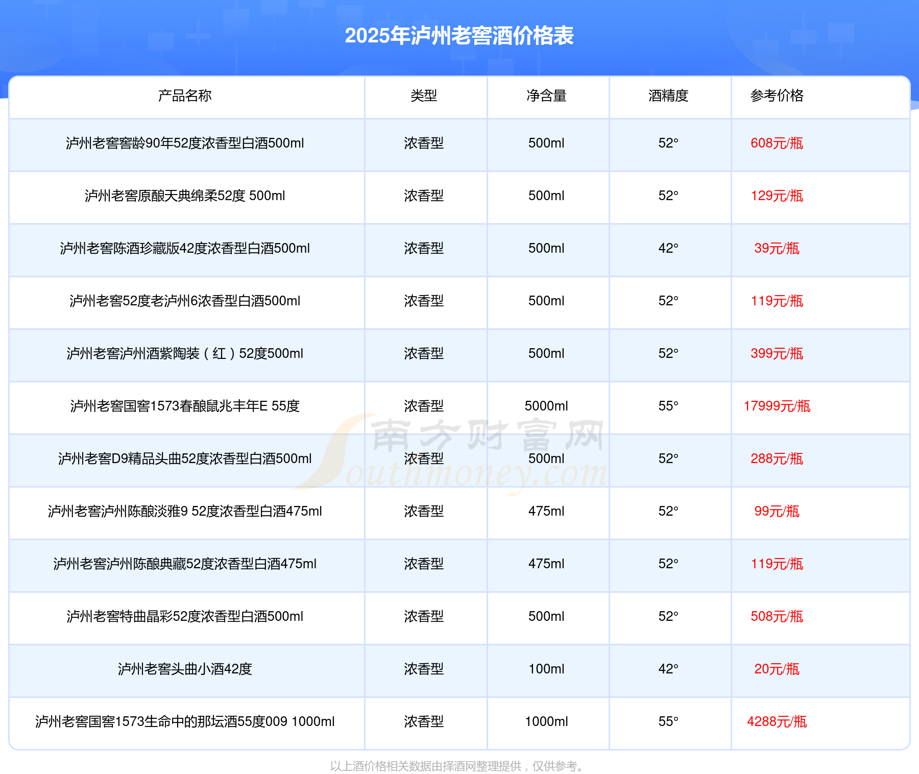 2025瀘州老窖酒最新價格:瀘州老窖國窖1573春釀鼠兆豐年E 55度參考價17999元/瓶、瀘州老窖國窖1573生命中的那壇酒55度014參考價9999元/瓶、瀘州老窖國窖1573春釀鼠兆豐年A 55度參考價5088元/瓶、瀘州老窖國窖1573生命中的那壇酒55度013濃香型白酒1000ml參考價4988元/瓶、瀘州老窖國窖1573生命中的那壇酒55度009 1000ml參考價4288元/瓶、瀘州老窖國窖1573中國品味52度濃香型白酒500ml參考價2888元/瓶、瀘州老窖國窖1573許燎源概念作品58度濃香型白酒1000ml參考價2680元/瓶。