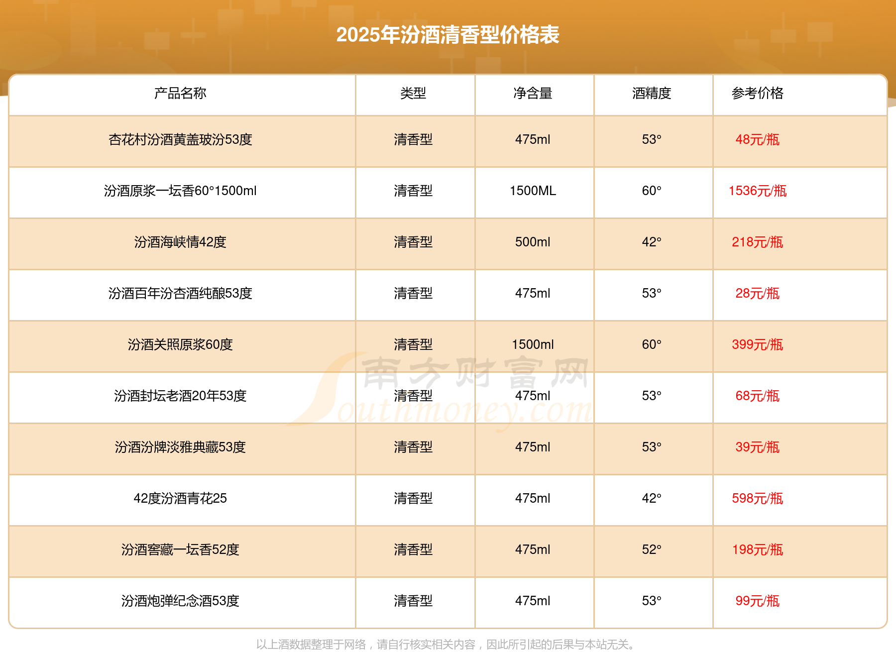 2025年,汾酒原漿一壇香60°3000ml、汾酒原漿一壇香60°1500ml、42度汾酒青花25等汾酒清香型酒價格如下: