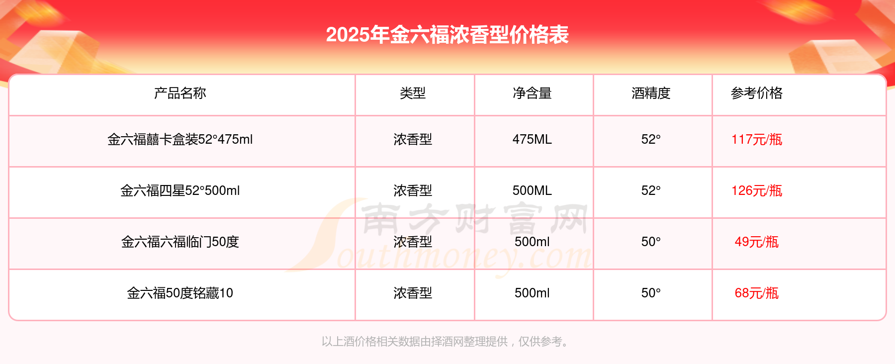 2025年金六福濃香型酒金六福四星52°500ml、金六福囍卡盒裝52°475ml、金六福50度銘藏10、金六福六福臨門50度等最新價格如下:金六福四星52°500ml參考價126元/瓶、金六福囍卡盒裝52°475ml參考價117元/瓶、金六福50度銘藏10參考價68元/瓶、金六福六福臨門50度參考價49元/瓶。