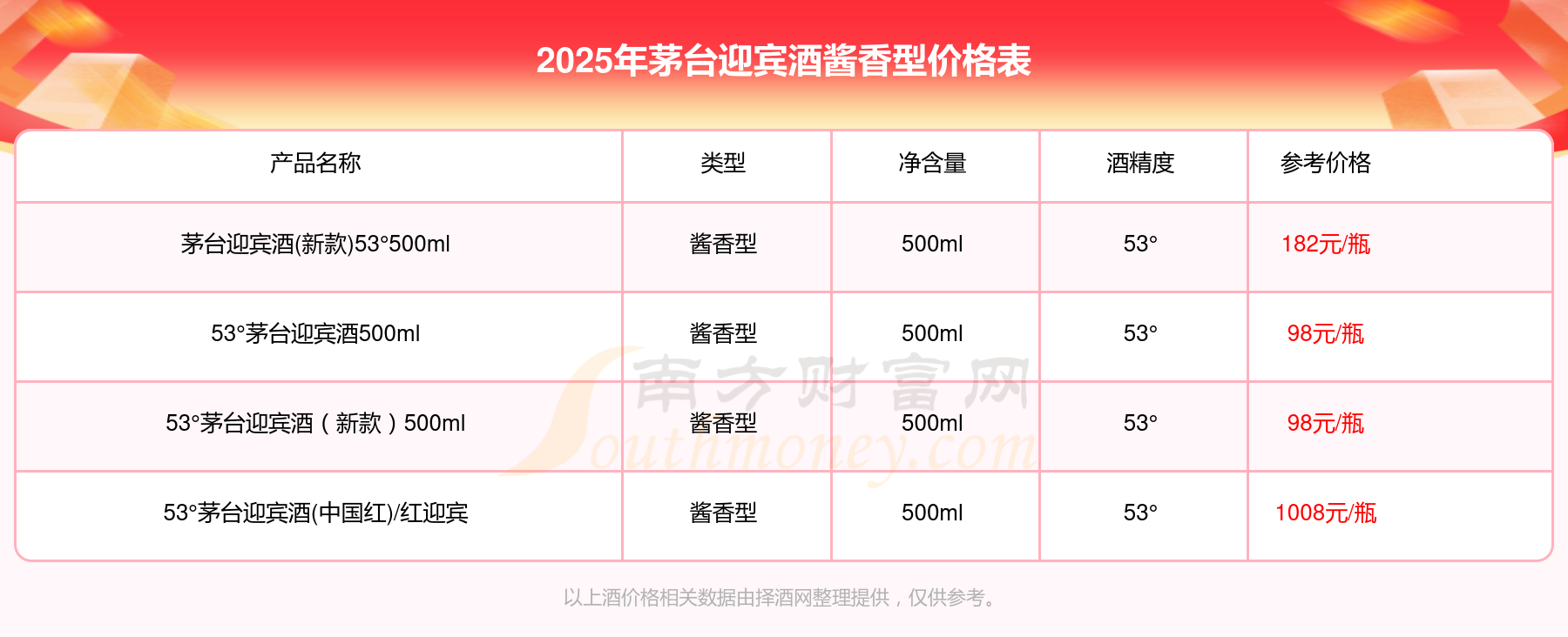 2025茅臺迎賓酒醬香型酒最新價格:53°茅臺迎賓酒(中國紅)/紅迎賓參考價1008元/瓶、茅臺迎賓酒(新款)53°500ml參考價182元/瓶、53°茅臺迎賓酒(新款)500ml參考價98元/瓶。