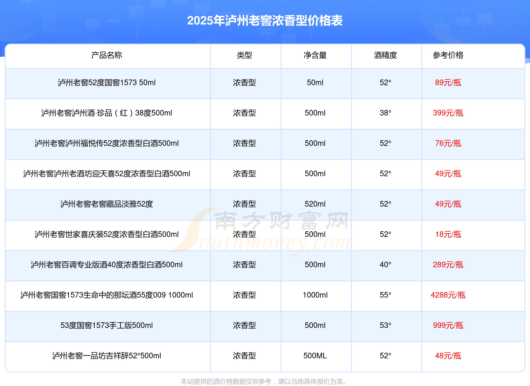 瀘州老窖國窖1573春釀鼠兆豐年E 55度參考價17999元/瓶、瀘州老窖國窖1573生命中的那壇酒55度014參考價9999元/瓶、瀘州老窖國窖1573春釀鼠兆豐年A 55度參考價5088元/瓶、瀘州老窖國窖1573生命中的那壇酒55度013濃香型白酒1000ml參考價4988元/瓶、瀘州老窖國窖1573生命中的那壇酒55度009 1000ml參考價4288元/瓶、瀘州老窖國窖1573中國品味52度濃香型白酒500ml參考價2888元/瓶。