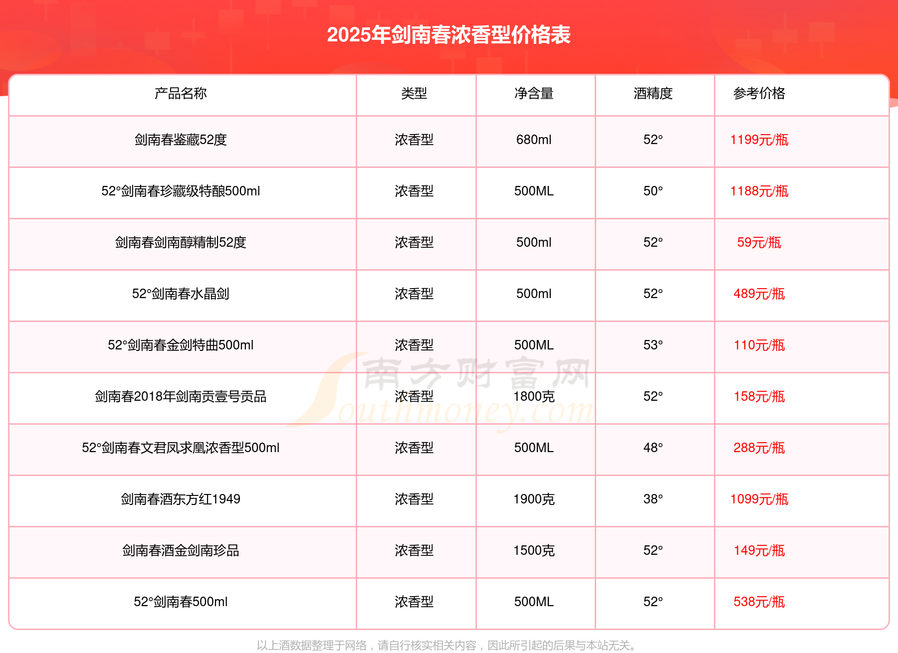 2025年劍南春濃香型酒劍南春鑒藏52度、52°劍南春珍藏級(jí)特釀500ml、劍南春酒東方紅1949、52°劍南春500ml、52°劍南春水晶劍、劍南春水晶劍38度、52°劍南春文君鳳求凰濃香型500ml等最新價(jià)格如下:劍南春鑒藏52度參考價(jià)1199元/瓶、52°劍南春珍藏級(jí)特釀500ml參考價(jià)1188元/瓶、劍南春酒東方紅1949參考價(jià)1099元/瓶、52°劍南春500ml參考價(jià)538元/瓶、52°劍南春水晶劍參考價(jià)489元/瓶、劍南春水晶劍38度參考價(jià)378元/瓶、52°劍南春文君鳳求凰濃香型500ml參考價(jià)288元/瓶。