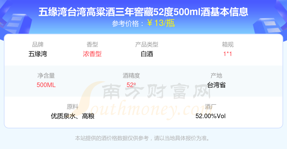 五緣灣臺灣高粱酒三年窖藏52度500ml基本信息