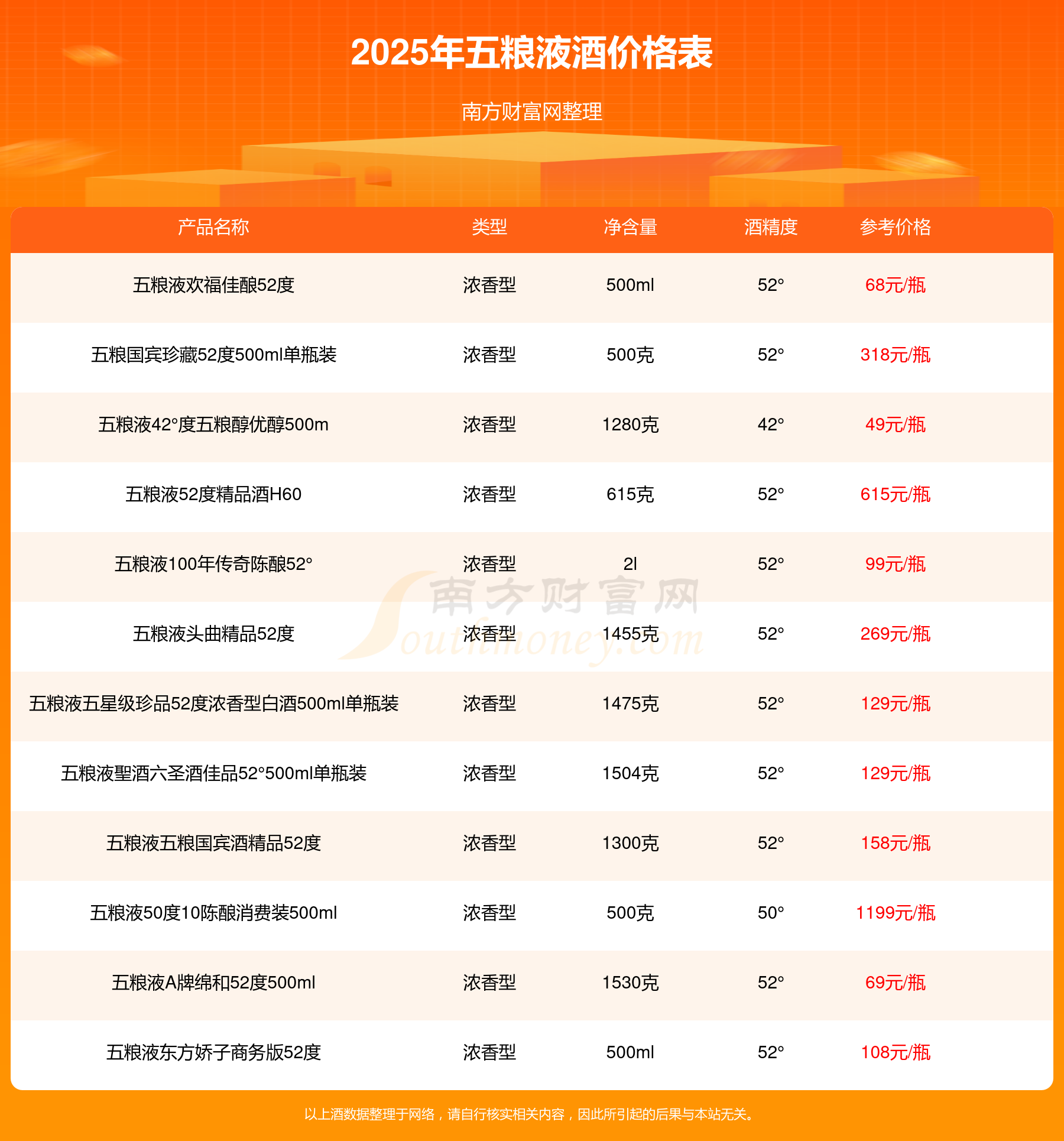 當(dāng)下五糧液酒價(jià)格最高的酒為五糧液百年世博世紀(jì)榮耀紀(jì)念酒60°999ml,參考價(jià)26980元/瓶,而五糧液酒價(jià)格最低的是五糧液干一杯小瓶46度,參考價(jià)16元/瓶,價(jià)格高低差為26964元/瓶。