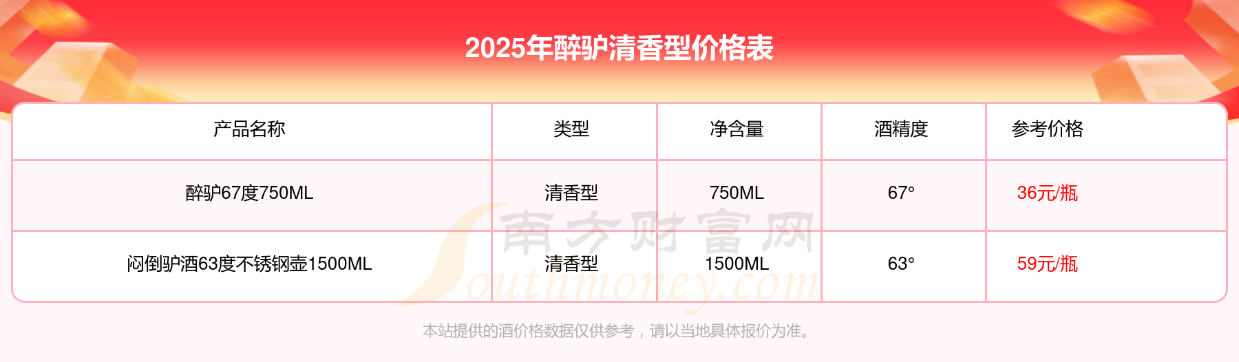 2025年,醉驢清香型酒價(jià)格最高的是悶倒驢酒63度不銹鋼壺1500ML,參考價(jià)59元,最低的是醉驢67度750ML,參考價(jià)36元,價(jià)格高低差為23元。