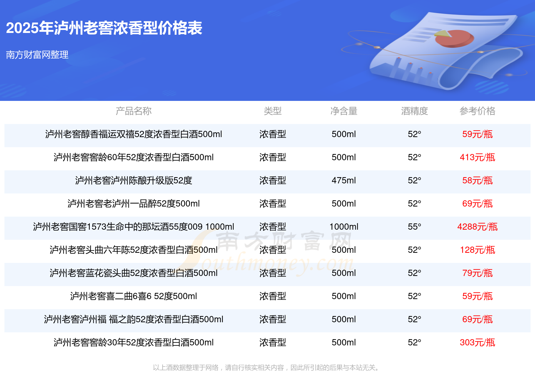 瀘州老窖國窖1573春釀鼠兆豐年E 55度參考價17999元/瓶、瀘州老窖國窖1573生命中的那壇酒55度014參考價9999元/瓶、瀘州老窖國窖1573春釀鼠兆豐年A 55度參考價5088元/瓶、瀘州老窖國窖1573生命中的那壇酒55度013濃香型白酒1000ml參考價4988元/瓶、瀘州老窖國窖1573生命中的那壇酒55度009 1000ml參考價4288元/瓶、瀘州老窖國窖1573中國品味52度濃香型白酒500ml參考價2888元/瓶。
