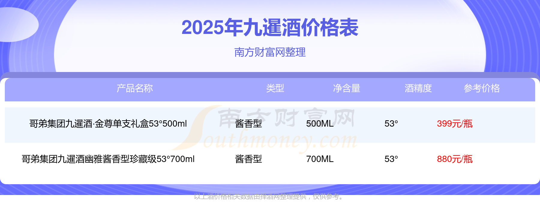哥弟集團九暹酒幽雅醬香型珍藏級53°700ml參考價880元/瓶、哥弟集團九暹酒·金尊單支禮盒53°500ml參考價399元/瓶。