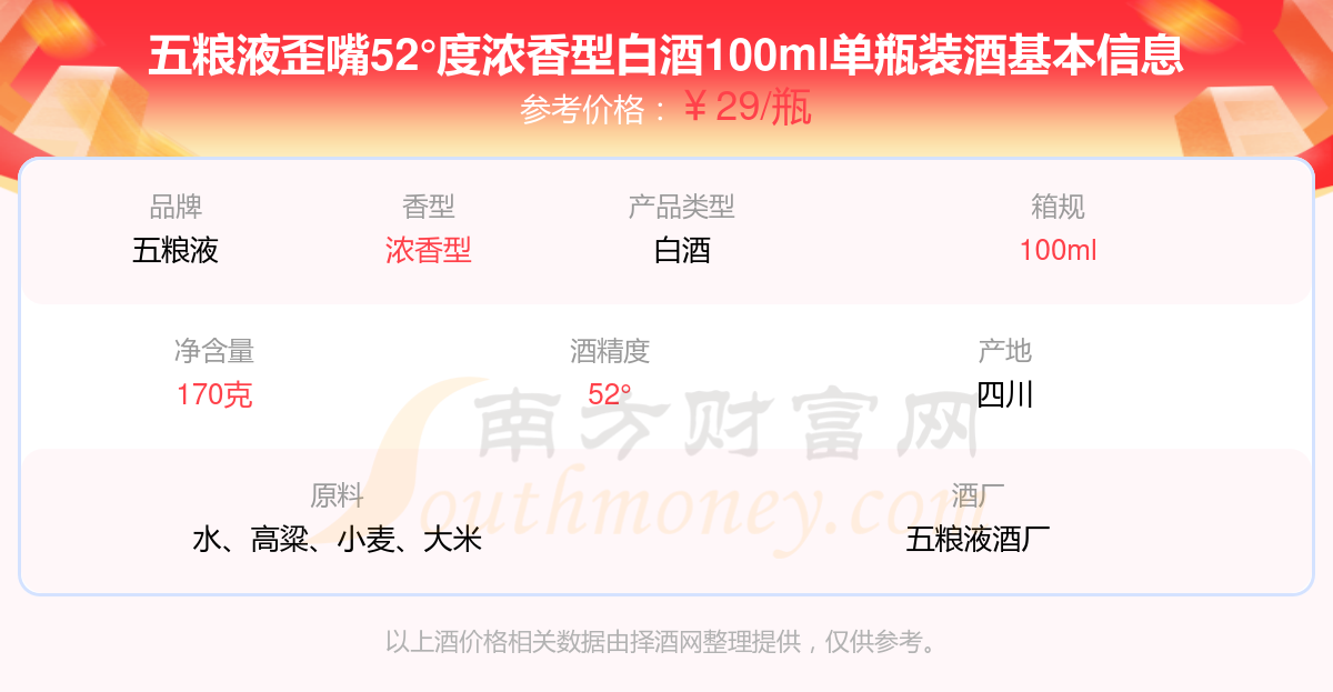 五糧液歪嘴52°度濃香型白酒100ml單瓶裝基本信息