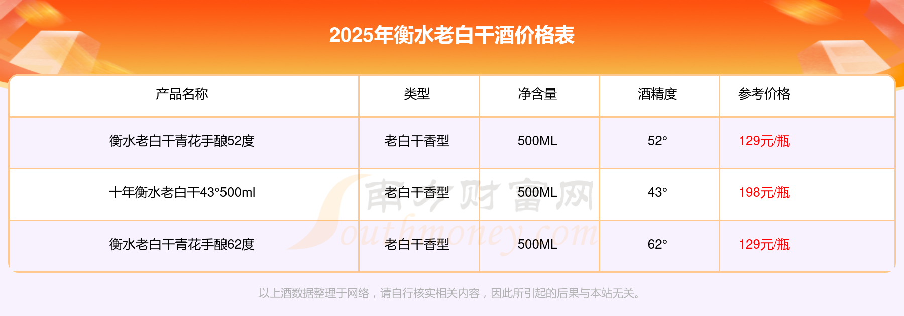 2025年,十年衡水老白干43°500ml、衡水老白干青花手釀52度、衡水老白干青花手釀62度等衡水老白干酒價格如下:十年衡水老白干43°500ml參考價198元/瓶、衡水老白干青花手釀52度參考價129元/瓶、衡水老白干青花手釀62度參考價129元/瓶。