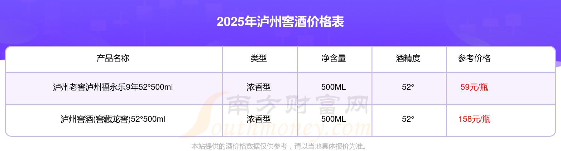 2025年,瀘州窖酒(窖藏龍窖)52°500ml、瀘州老窖瀘州福永樂9年52°500ml等瀘州窖酒價格如下:瀘州窖酒(窖藏龍窖)52°500ml參考價158元/瓶、瀘州老窖瀘州福永樂9年52°500ml參考價59元/瓶。