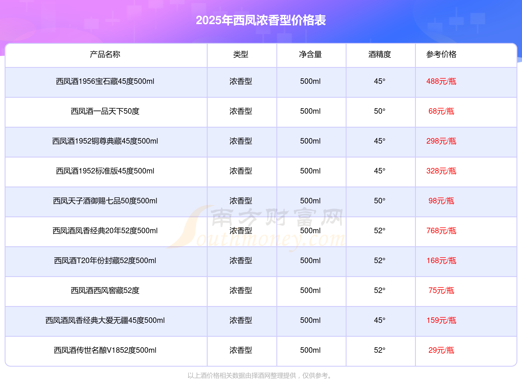 2025年,西鳳酒 酒海私藏55度3000ml、西鳳酒1952金獎50 55度500ml、西鳳酒2013年產(chǎn)老酒鳳香經(jīng)典30年52度500ml、西鳳酒1952金獎30 55度500ml、西鳳酒鳳香經(jīng)典20年52度500ml、西鳳酒1952金獎30 45度500ml、西鳳酒1956紀念版52度500ml等西鳳濃香型酒參考價格如下:西鳳酒 酒海私藏55度3000ml參考價8880元、西鳳酒1952金獎50 55度500ml參考價2380元、西鳳酒2013年產(chǎn)老酒鳳香經(jīng)典30年52度500ml參考價1280元、西鳳酒1952金獎30 55度500ml參考價898元、西鳳酒鳳香經(jīng)典20年52度500ml參考價768元、西鳳酒1952金獎30 45度500ml參考價658元、西鳳酒1956紀念版52度500ml參考價498元。