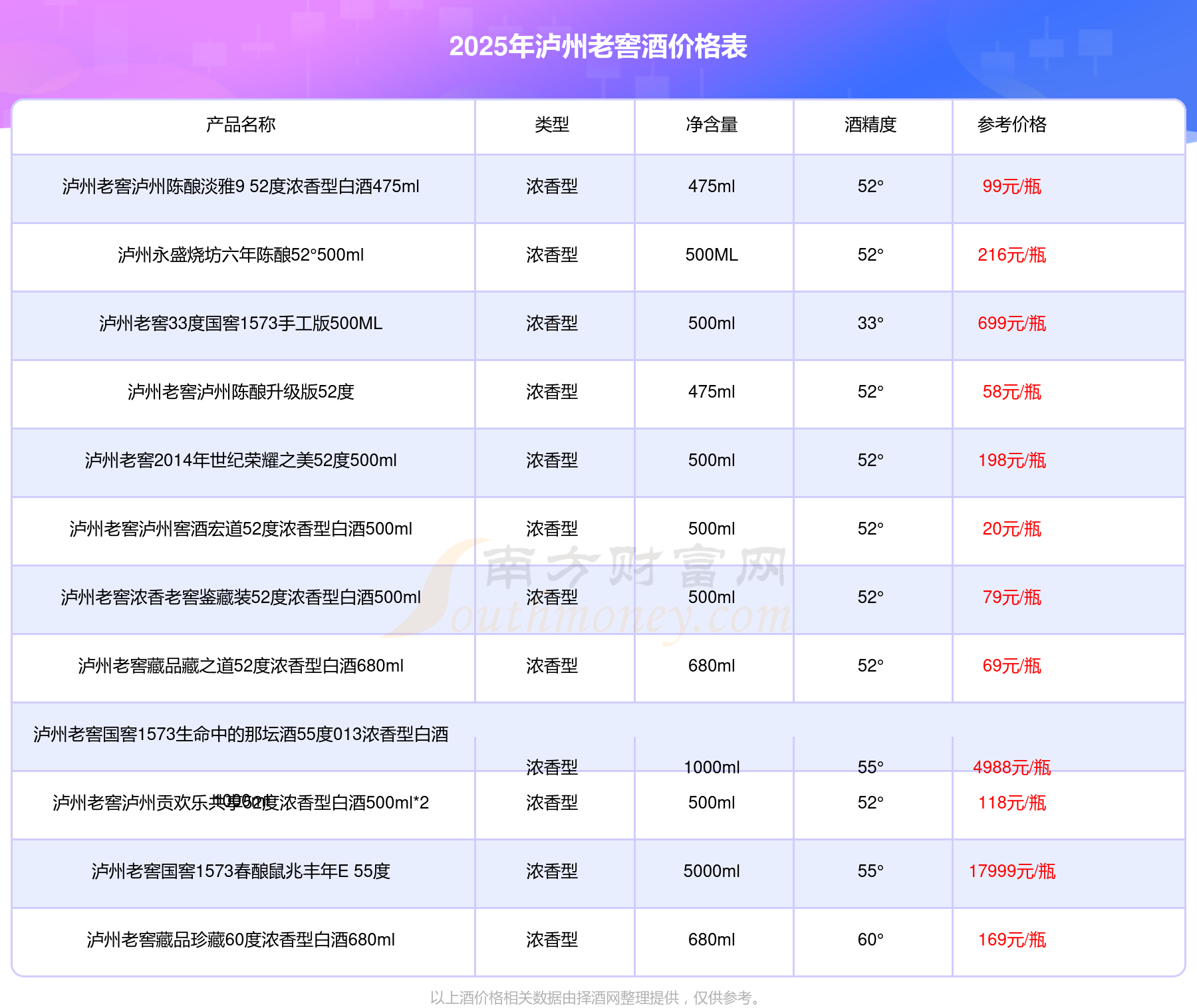 2025年,瀘州老窖國(guó)窖1573春釀鼠兆豐年E 55度、瀘州老窖國(guó)窖1573生命中的那壇酒55度014、瀘州老窖國(guó)窖1573春釀鼠兆豐年A 55度、瀘州老窖國(guó)窖1573生命中的那壇酒55度013濃香型白酒1000ml、瀘州老窖國(guó)窖1573生命中的那壇酒55度009 1000ml、瀘州老窖國(guó)窖1573中國(guó)品味52度濃香型白酒500ml、瀘州老窖國(guó)窖1573許燎源概念作品58度濃香型白酒1000ml、瀘州老窖52度國(guó)窖1573狗年生肖禮盒等瀘州老窖酒價(jià)格如下:瀘州老窖國(guó)窖1573春釀鼠兆豐年E 55度參考價(jià)17999元/瓶、瀘州老窖國(guó)窖1573生命中的那壇酒55度014參考價(jià)9999元/瓶、瀘州老窖國(guó)窖1573春釀鼠兆豐年A 55度參考價(jià)5088元/瓶、瀘州老窖國(guó)窖1573生命中的那壇酒55度013濃香型白酒1000ml參考價(jià)4988元/瓶、瀘州老窖國(guó)窖1573生命中的那壇酒55度009 1000ml參考價(jià)4288元/瓶、瀘州老窖國(guó)窖1573中國(guó)品味52度濃香型白酒500ml參考價(jià)2888元/瓶、瀘州老窖國(guó)窖1573許燎源概念作品58度濃香型白酒1000ml參考價(jià)2680元/瓶、瀘州老窖52度國(guó)窖1573狗年生肖禮盒參考價(jià)2143元/瓶。
