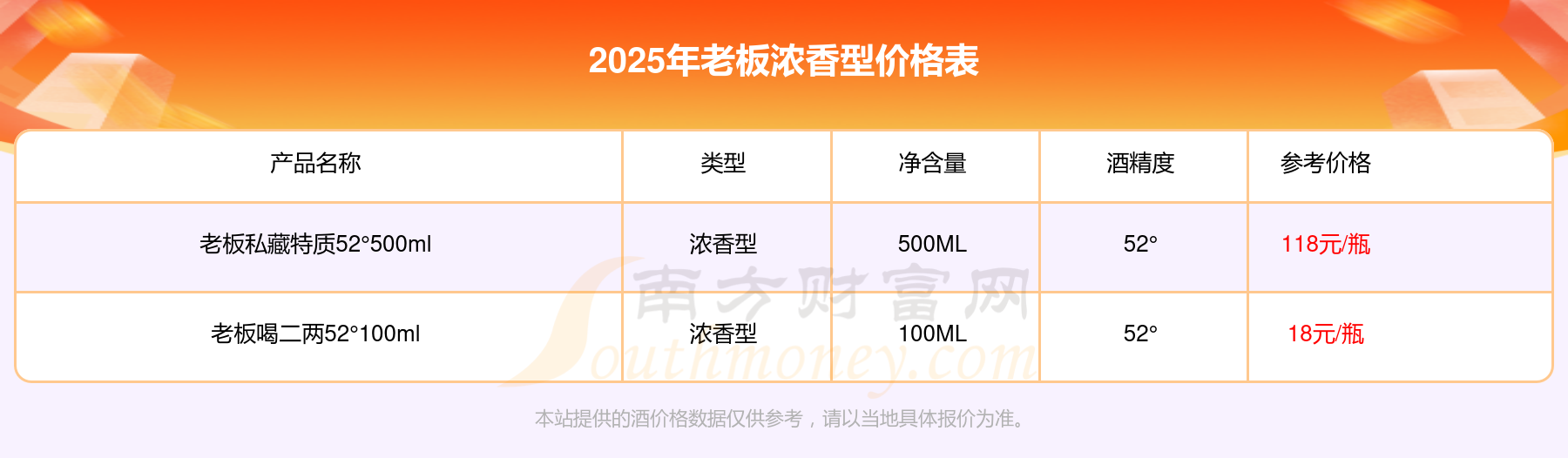 老板私藏特質(zhì)52°500ml參考價(jià)118元/瓶、老板喝二兩52°100ml參考價(jià)18元/瓶。