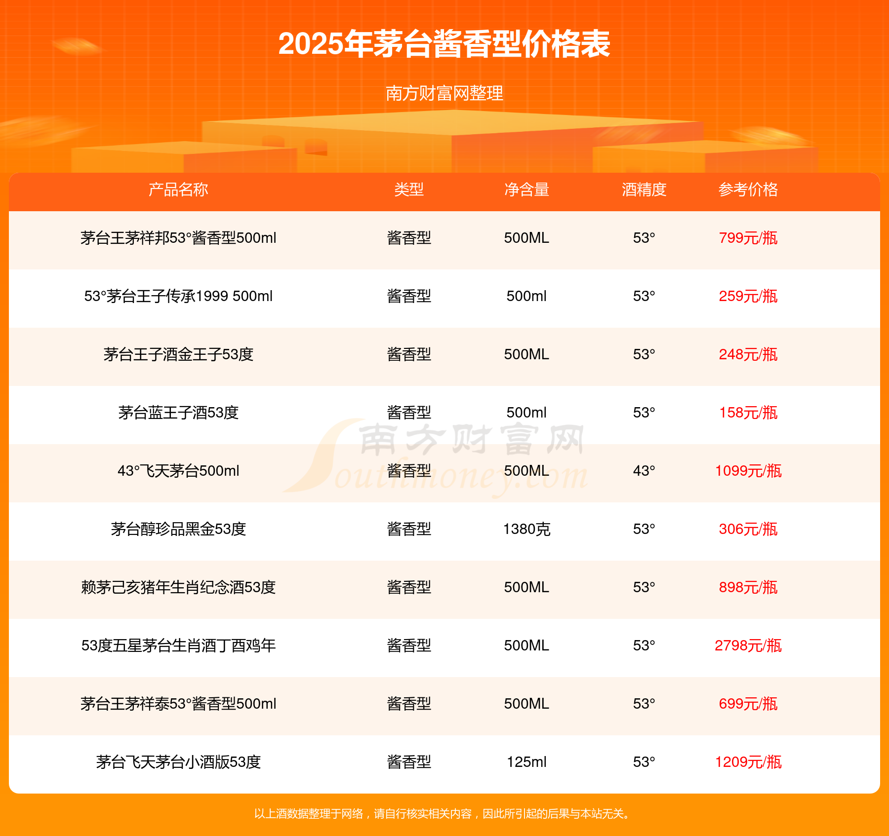 茅臺醬香型酒最新價格2025:華茅鑒藏 醬香型白酒 3L 53°參考價8388元/瓶、53度五星茅臺生肖酒丁酉雞年參考價2798元/瓶、貴州茅臺己亥豬年生肖酒53°500ml參考價2699元/瓶、53度五星茅臺生肖酒戊戌狗年參考價2698元/瓶、飛天茅臺53°500ml(2015年)參考價2199元/瓶、茅臺王子酒己亥豬年生肖紀念酒53度2.5L參考價2099元/瓶、茅臺1935醬香型53度參考價1799元/瓶、茅臺財富貴賓典藏酒53度參考價1599元/瓶。