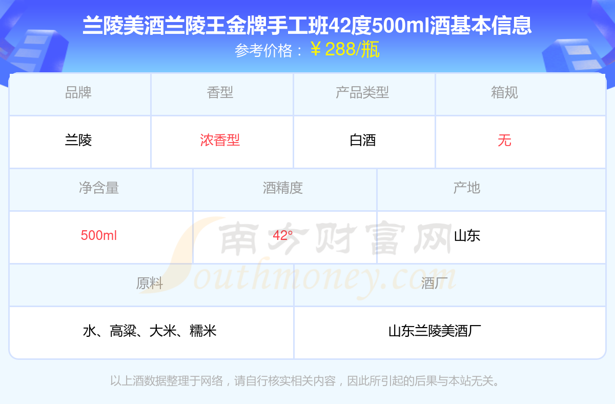 蘭陵美酒蘭陵王金牌手工班42度500ml基本信息