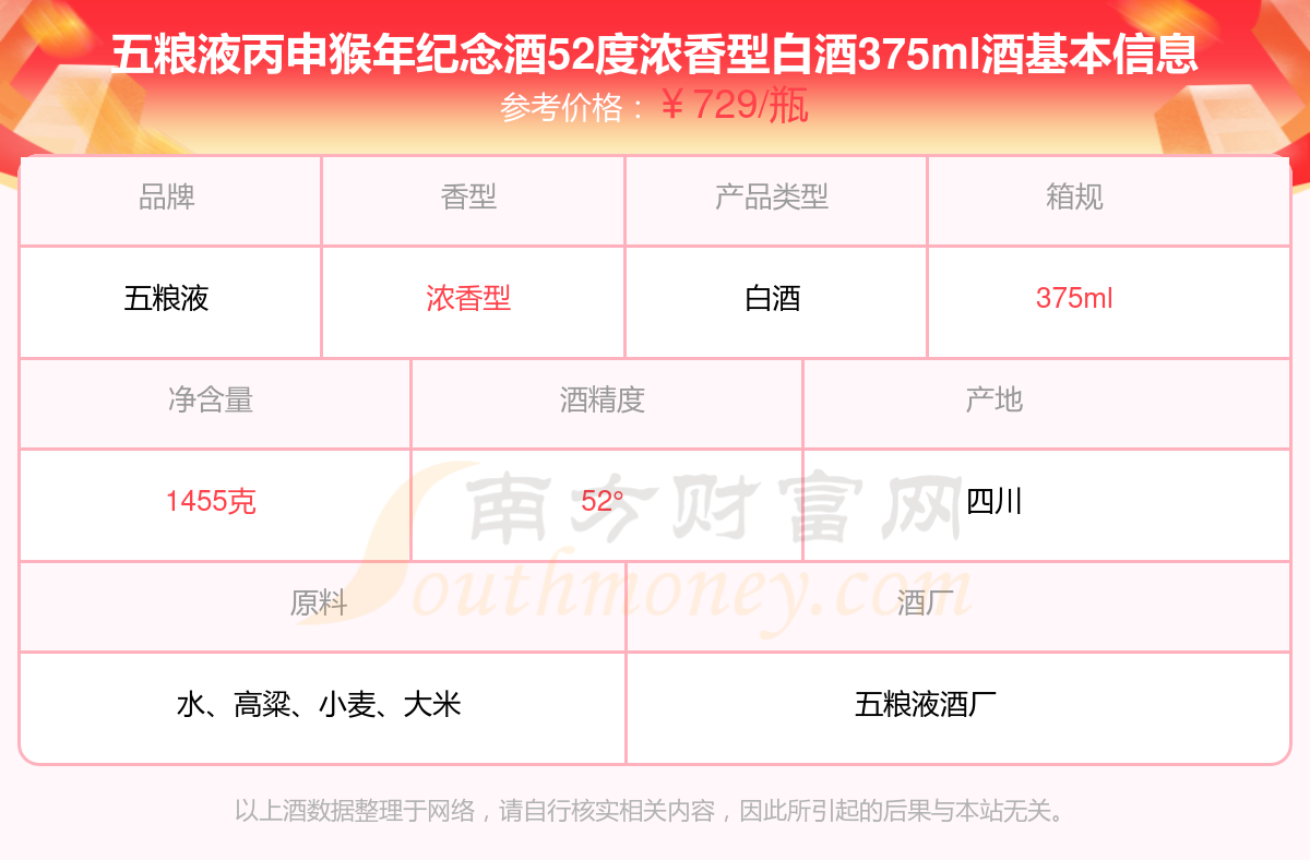五糧液丙申猴年紀(jì)念酒52度濃香型白酒375ml基本信息