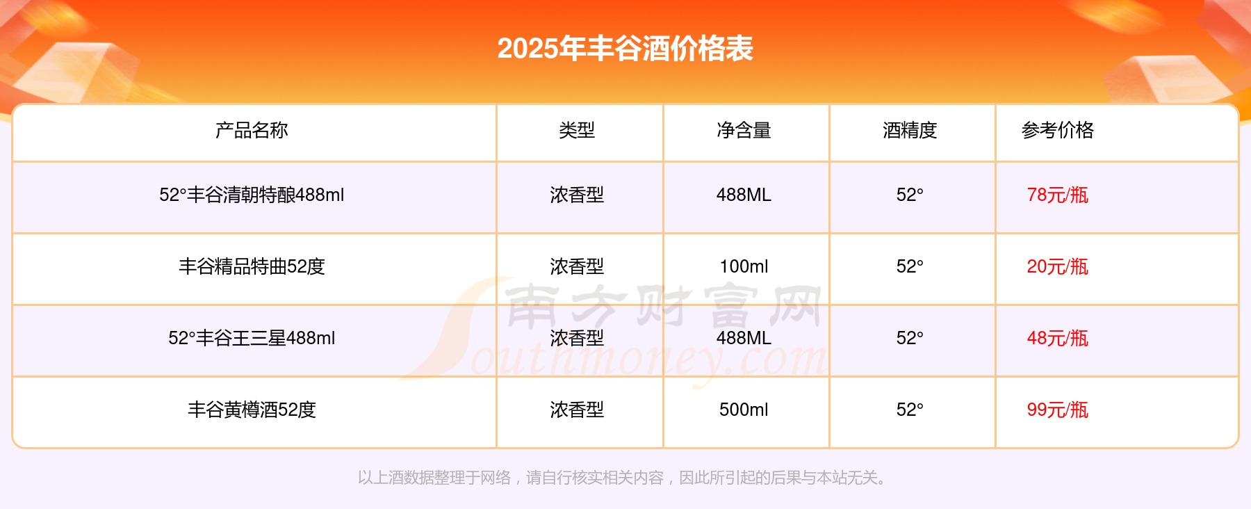 2025豐谷酒最新價(jià)格:豐谷黃樽酒52度參考價(jià)99元/瓶、52°豐谷清朝特釀488ml參考價(jià)78元/瓶、52°豐谷王三星488ml參考價(jià)48元/瓶、豐谷精品特曲52度參考價(jià)20元/瓶。