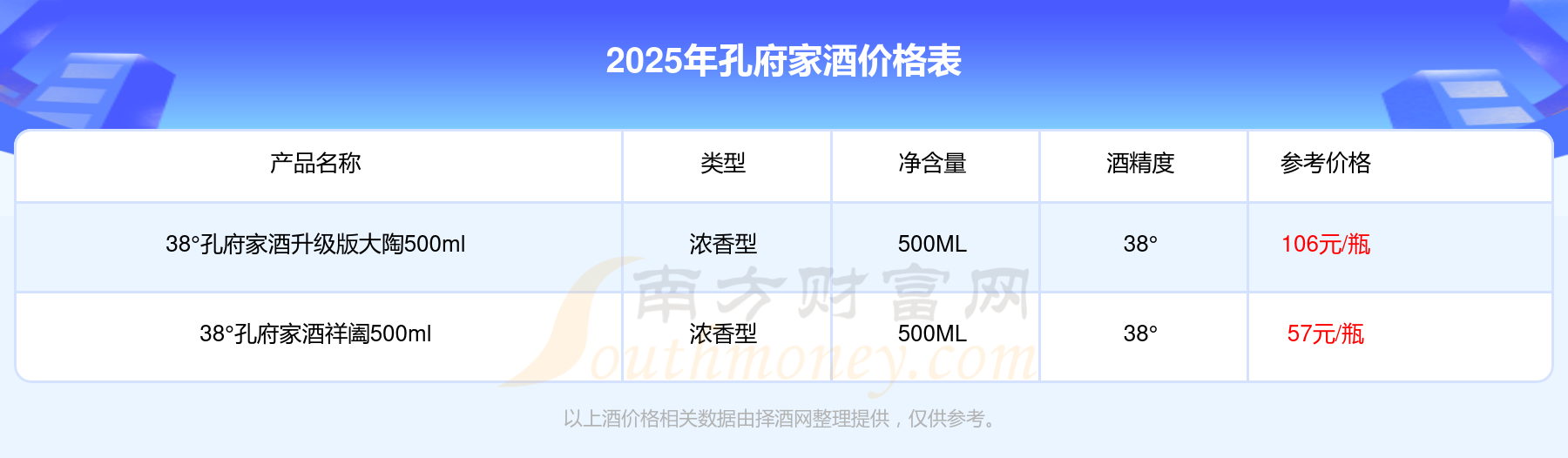 38°孔府家酒升級版大陶500ml參考價106元/瓶、38°孔府家酒祥闔500ml參考價57元/瓶。