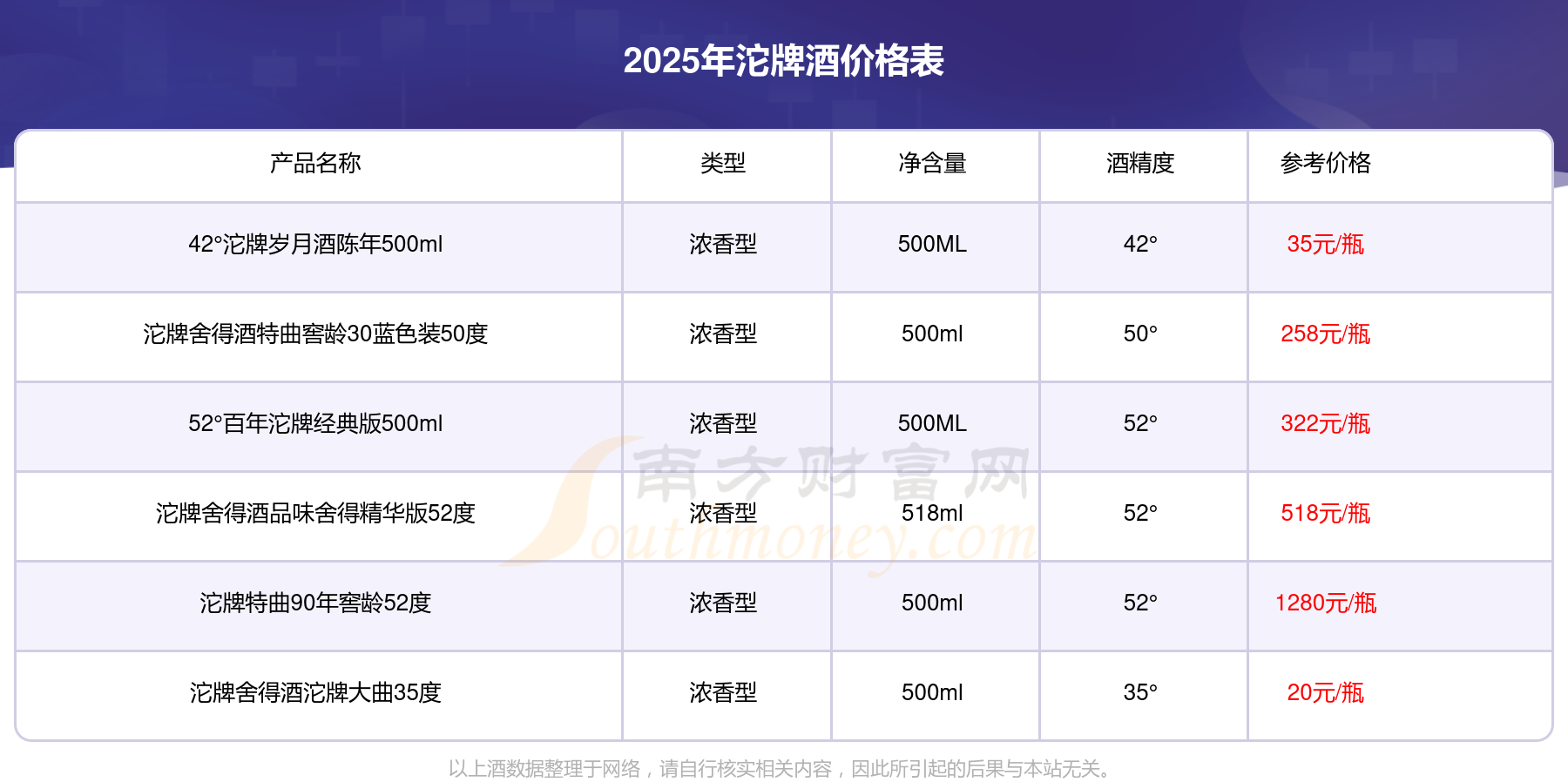 沱牌酒最新價格2025:沱牌特曲90年窖齡52度參考價1280元/瓶、沱牌舍得酒品味舍得精華版52度參考價518元/瓶、52°百年沱牌經(jīng)典版500ml參考價322元/瓶、沱牌舍得酒特曲窖齡30藍(lán)色裝50度參考價258元/瓶、42°沱牌歲月酒陳年500ml參考價35元/瓶、沱牌舍得酒沱牌大曲35度參考價20元/瓶。