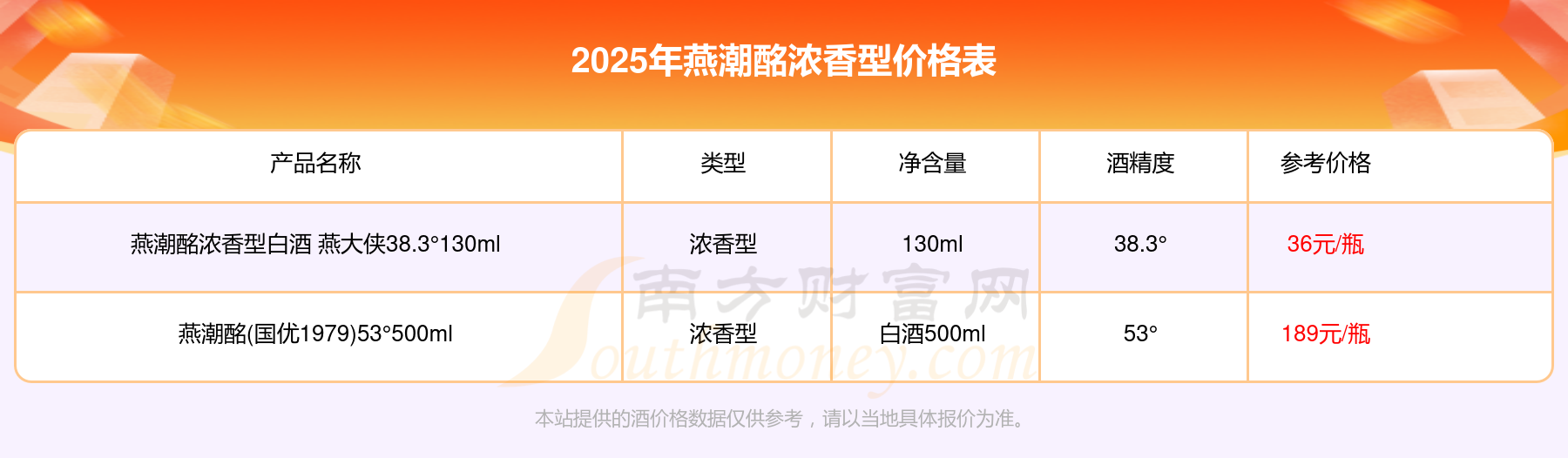 2025年燕潮酩濃香型酒燕潮酩(國(guó)優(yōu)1979)53°500ml、燕潮酩濃香型白酒 燕大俠38.3°130ml等最新價(jià)格如下:燕潮酩(國(guó)優(yōu)1979)53°500ml參考價(jià)189元/瓶、燕潮酩濃香型白酒 燕大俠38.3°130ml參考價(jià)36元/瓶。