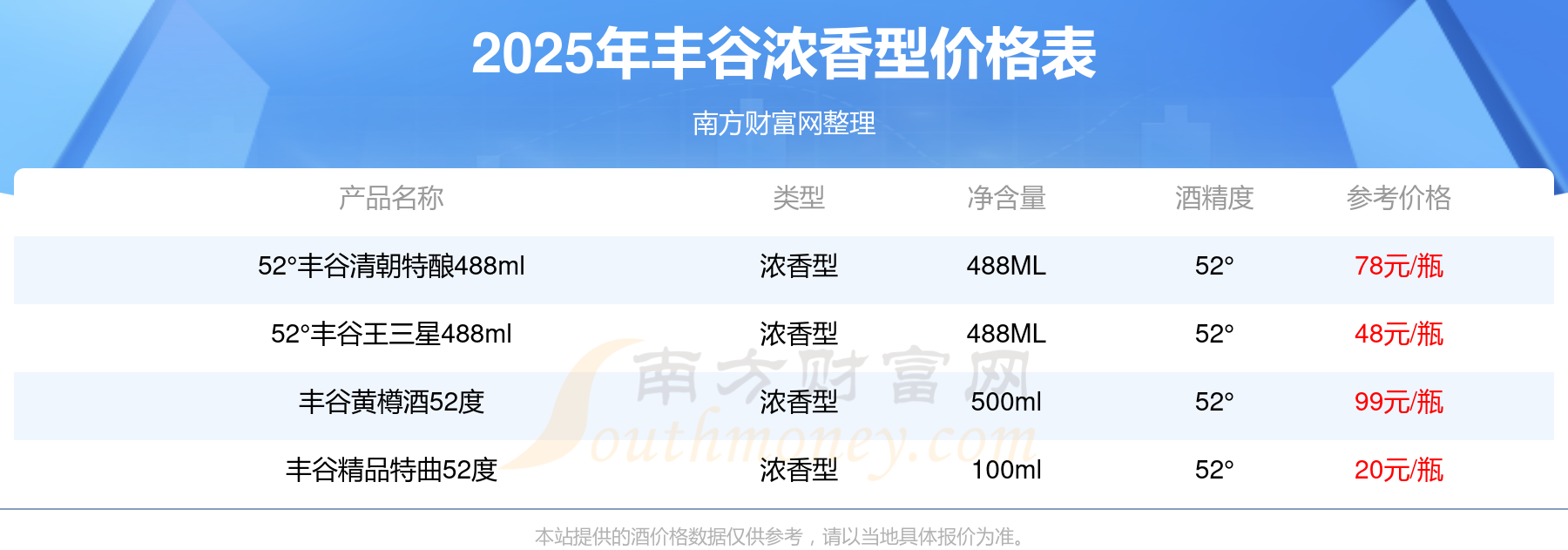 2025年,豐谷黃樽酒52度、52°豐谷清朝特釀488ml、52°豐谷王三星488ml、豐谷精品特曲52度等豐谷濃香型酒參考價格如下:豐谷黃樽酒52度參考價99元、52°豐谷清朝特釀488ml參考價78元、52°豐谷王三星488ml參考價48元、豐谷精品特曲52度參考價20元。