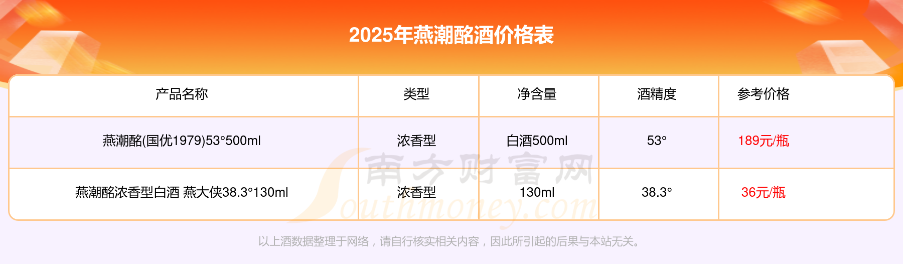 燕潮酩(國(guó)優(yōu)1979)53°500ml參考價(jià)189元/瓶、燕潮酩濃香型白酒 燕大俠38.3°130ml參考價(jià)36元/瓶。
