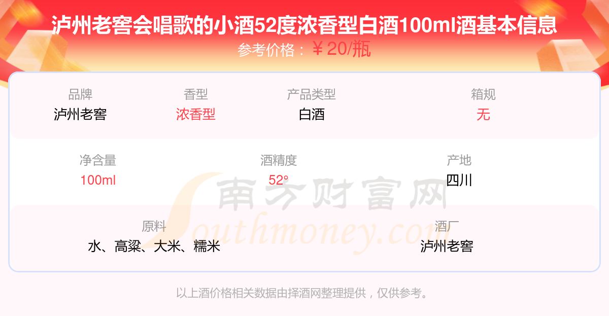 瀘州老窖會唱歌的小酒52度濃香型白酒100ml基本信息