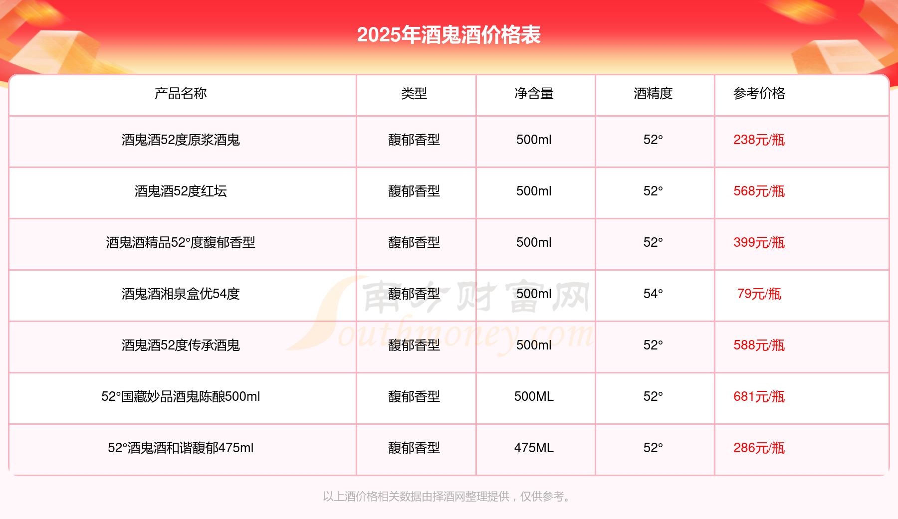 2025年,52°國(guó)藏妙品酒鬼陳釀500ml、酒鬼酒52度傳承酒鬼、酒鬼酒52度紅壇、酒鬼酒精品52°度馥郁香型、52°酒鬼酒和諧馥郁475ml、酒鬼酒52度原漿酒鬼、酒鬼酒湘泉盒優(yōu)54度等酒鬼酒價(jià)格如下:52°國(guó)藏妙品酒鬼陳釀500ml參考價(jià)681元/瓶、酒鬼酒52度傳承酒鬼參考價(jià)588元/瓶、酒鬼酒52度紅壇參考價(jià)568元/瓶、酒鬼酒精品52°度馥郁香型參考價(jià)399元/瓶、52°酒鬼酒和諧馥郁475ml參考價(jià)286元/瓶、酒鬼酒52度原漿酒鬼參考價(jià)238元/瓶、酒鬼酒湘泉盒優(yōu)54度參考價(jià)79元/瓶。