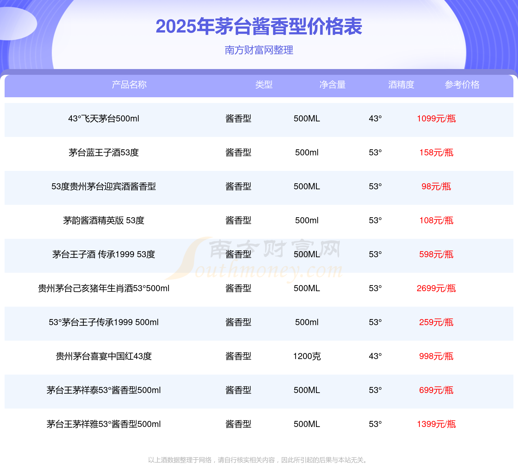 茅臺(tái)醬香型酒最新價(jià)格2025:華茅鑒藏 醬香型白酒 3L 53°參考價(jià)8388元/瓶、53度五星茅臺(tái)生肖酒丁酉雞年參考價(jià)2798元/瓶、貴州茅臺(tái)己亥豬年生肖酒53°500ml參考價(jià)2699元/瓶、53度五星茅臺(tái)生肖酒戊戌狗年參考價(jià)2698元/瓶、飛天茅臺(tái)53°500ml(2015年)參考價(jià)2199元/瓶、茅臺(tái)王子酒己亥豬年生肖紀(jì)念酒53度2.5L參考價(jià)2099元/瓶、茅臺(tái)1935醬香型53度參考價(jià)1799元/瓶、茅臺(tái)財(cái)富貴賓典藏酒53度參考價(jià)1599元/瓶。