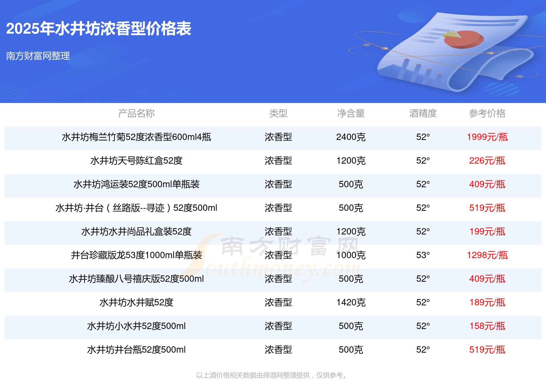 水井坊濃香型酒最新價(jià)格2025:水井坊大壇收藏級(jí)原漿天球瓶66度參考價(jià)13999元/瓶、水井坊博物館壹號(hào)53度雙瓶裝參考價(jià)10988元/瓶、53°水井坊公元十三600ml參考價(jià)2580元/瓶、水井坊梅蘭竹菊52度濃香型600ml4瓶參考價(jià)1999元/瓶。