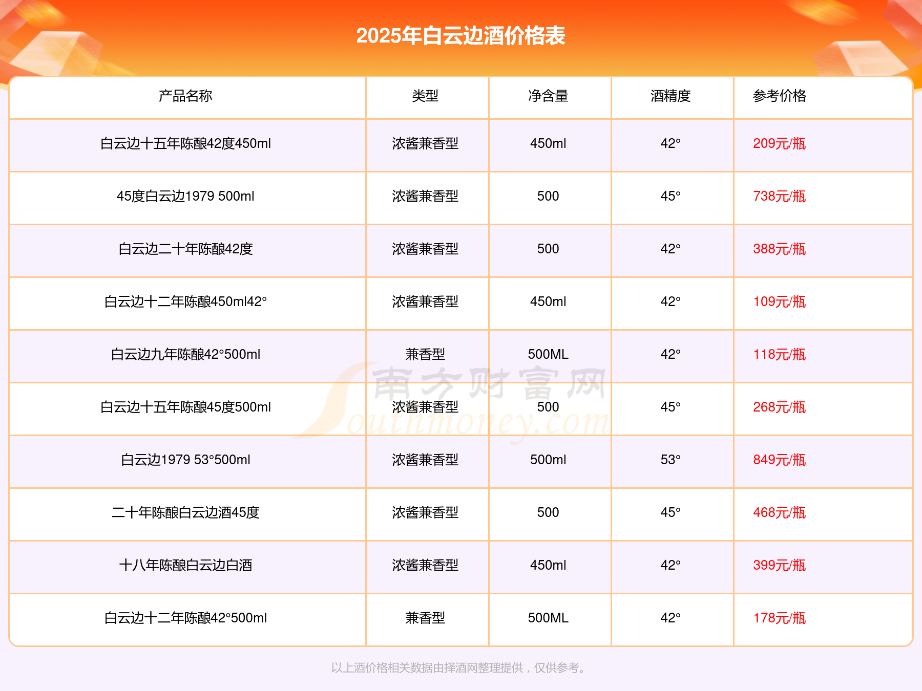 2025年,白云邊酒價格最高的是白云邊1979 53°500ml,參考價849元,最低的是白云邊十二年陳釀450ml42°,參考價109元,價格高低差為740元。