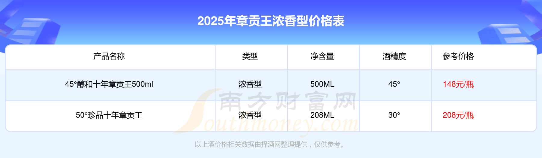 50°珍品十年章貢王參考價(jià)208元/瓶、45°醇和十年章貢王500ml參考價(jià)148元/瓶。