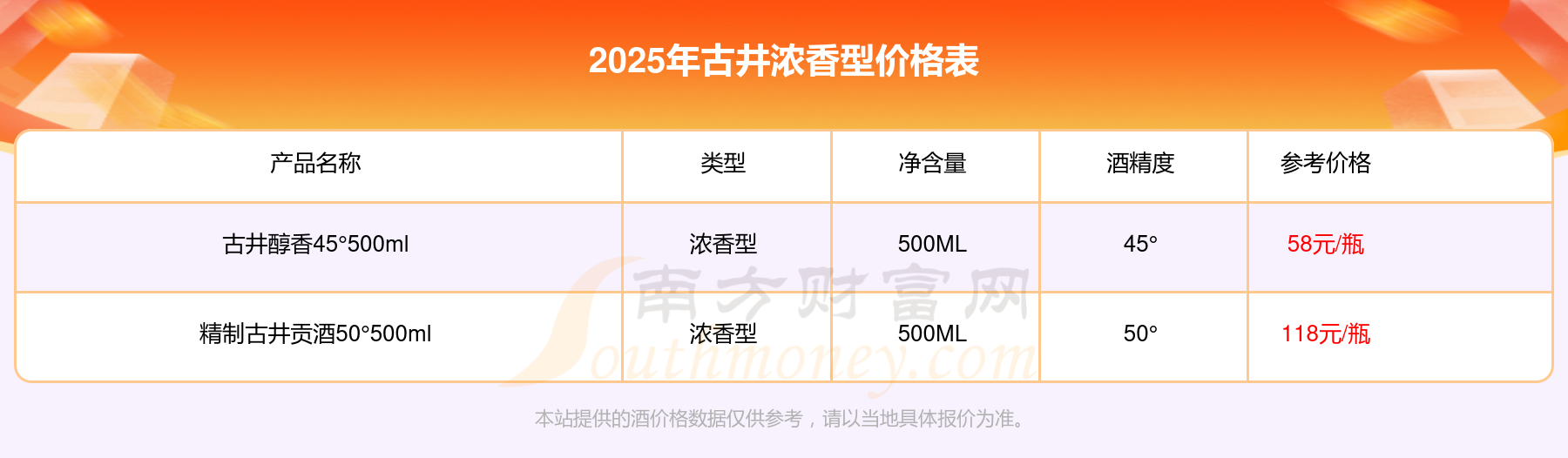 2025年古井濃香型酒精制古井貢酒50°500ml、古井醇香45°500ml等最新價(jià)格如下: