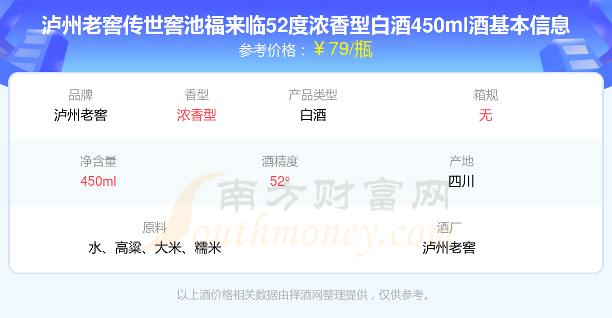 瀘州老窖傳世窖池福來臨52度濃香型白酒450ml基本信息