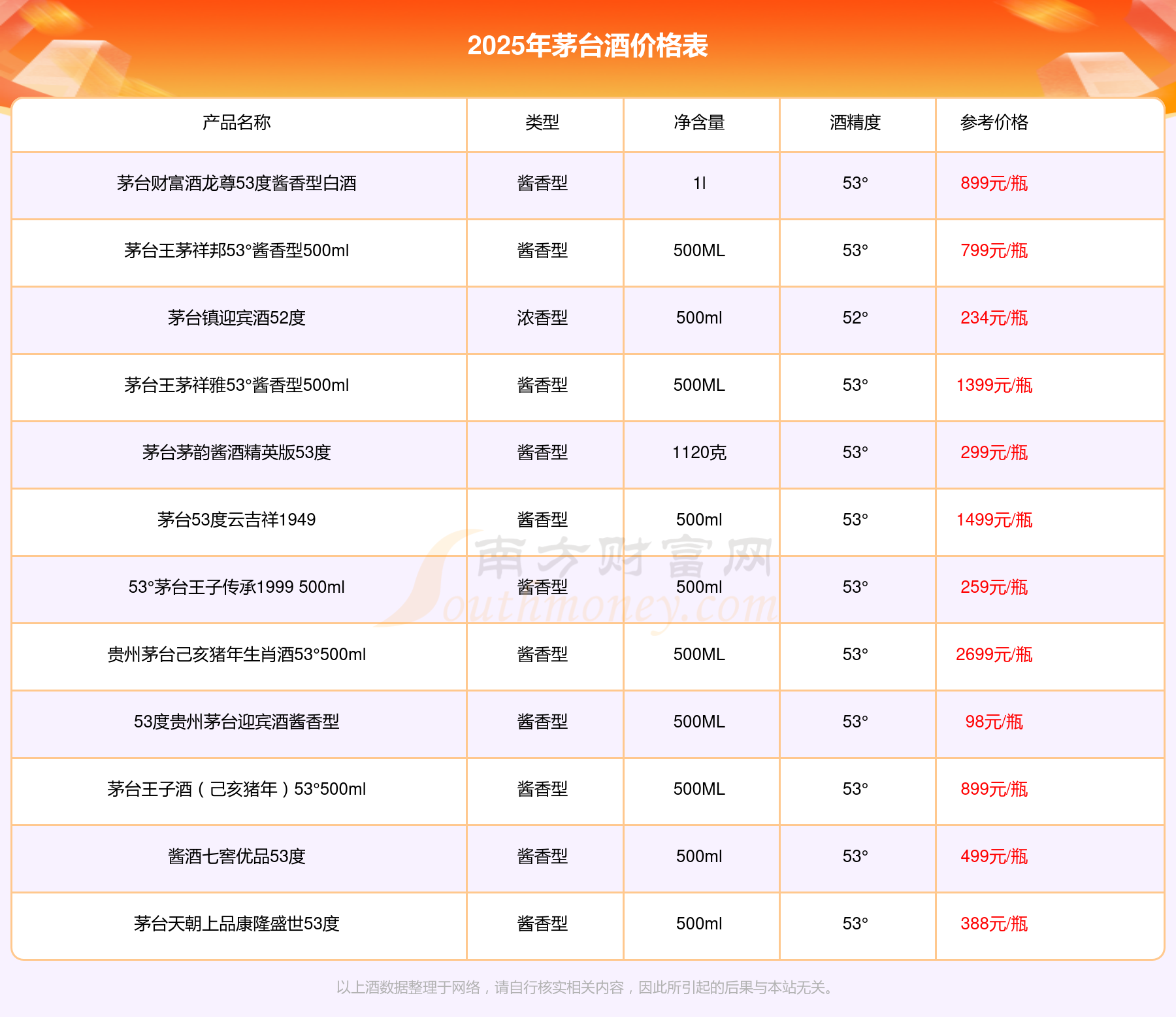 2025年茅臺酒華茅鑒藏 醬香型白酒 3L 53°、53度五星茅臺生肖酒丁酉雞年、貴州茅臺己亥豬年生肖酒53°500ml、53度五星茅臺生肖酒戊戌狗年等最新價格如下: