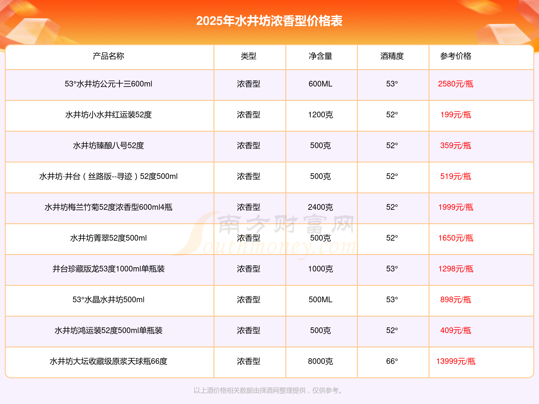 2025年水井坊濃香型酒水井坊大壇收藏級原漿天球瓶66度、水井坊博物館壹號53度雙瓶裝、53°水井坊公元十三600ml、水井坊梅蘭竹菊52度濃香型600ml4瓶、水井坊菁翠52度500ml等最新價(jià)格如下: