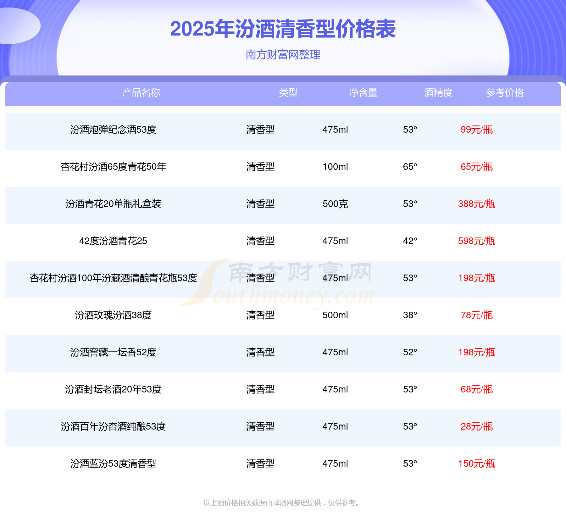 2025年汾酒清香型價格最高的酒是汾酒原漿一壇香60°3000ml,參考價2180元/瓶,最低的是汾酒百年汾杏酒純釀53度,參考價28元/瓶,價格高低差為2152元/瓶。