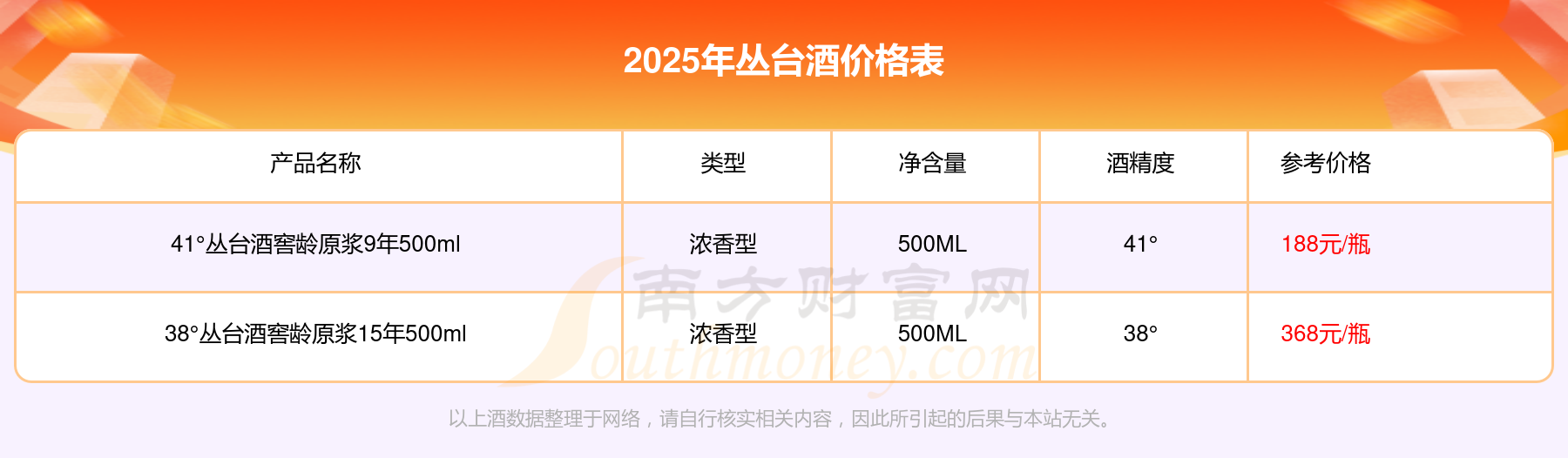 2025年叢臺(tái)酒38°叢臺(tái)酒窖齡原漿15年500ml、41°叢臺(tái)酒窖齡原漿9年500ml等最新價(jià)格如下: