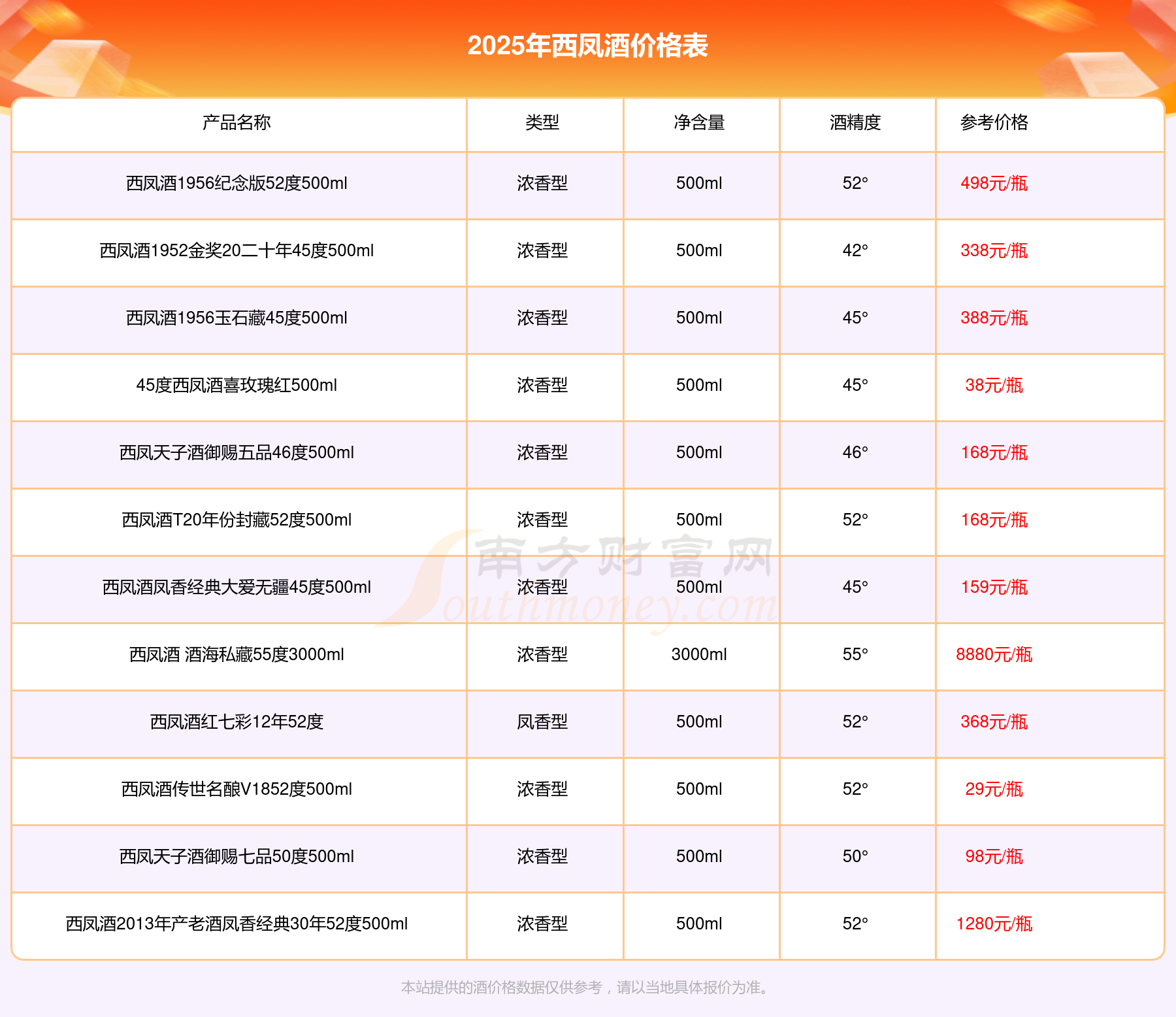 2025西鳳酒最新價格:西鳳酒 酒海私藏55度3000ml參考價8880元/瓶、西鳳酒1952金獎50 55度500ml參考價2380元/瓶、西鳳酒2013年產(chǎn)老酒鳳香經(jīng)典30年52度500ml參考價1280元/瓶、西鳳酒1956鉆石藏45度500ml參考價980元/瓶、西鳳酒1952金獎30 55度500ml參考價898元/瓶。