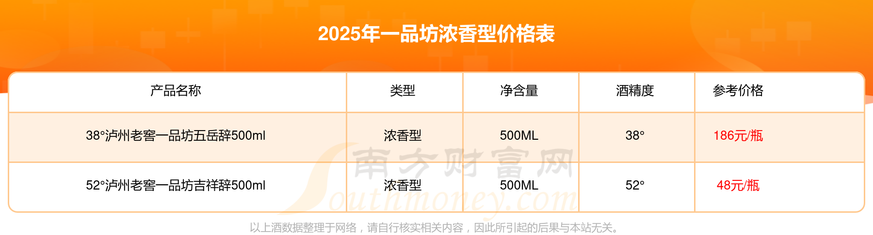 2025一品坊濃香型酒最新價(jià)格:38°瀘州老窖一品坊五岳辭500ml參考價(jià)186元/瓶、52°瀘州老窖一品坊吉祥辭500ml參考價(jià)48元/瓶。