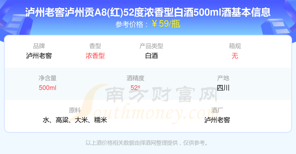 瀘州老窖瀘州貢A8(紅)52度濃香型白酒500ml基本信息