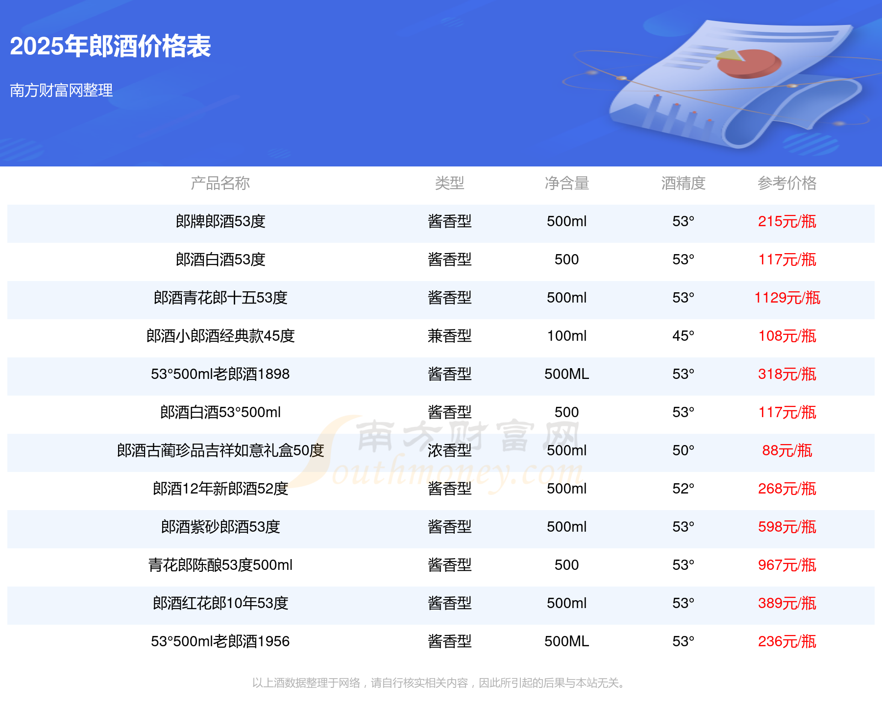 郎酒青花郎十五53度參考價1129元/瓶、青花郎陳釀53度500ml參考價967元/瓶、郎酒紫砂郎酒53度參考價598元/瓶、郎酒紅花郎10年53度參考價389元/瓶、53°500ml老郎酒1898參考價318元/瓶、郎酒12年新郎酒52度參考價268元/瓶。