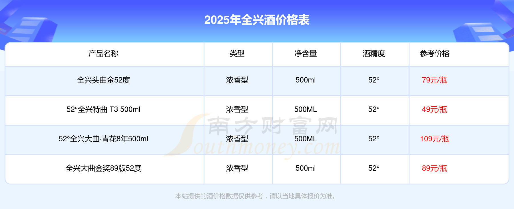 52°全興大曲·青花8年500ml參考價109元/瓶、全興大曲金獎89版52度參考價89元/瓶、全興頭曲金52度參考價79元/瓶。