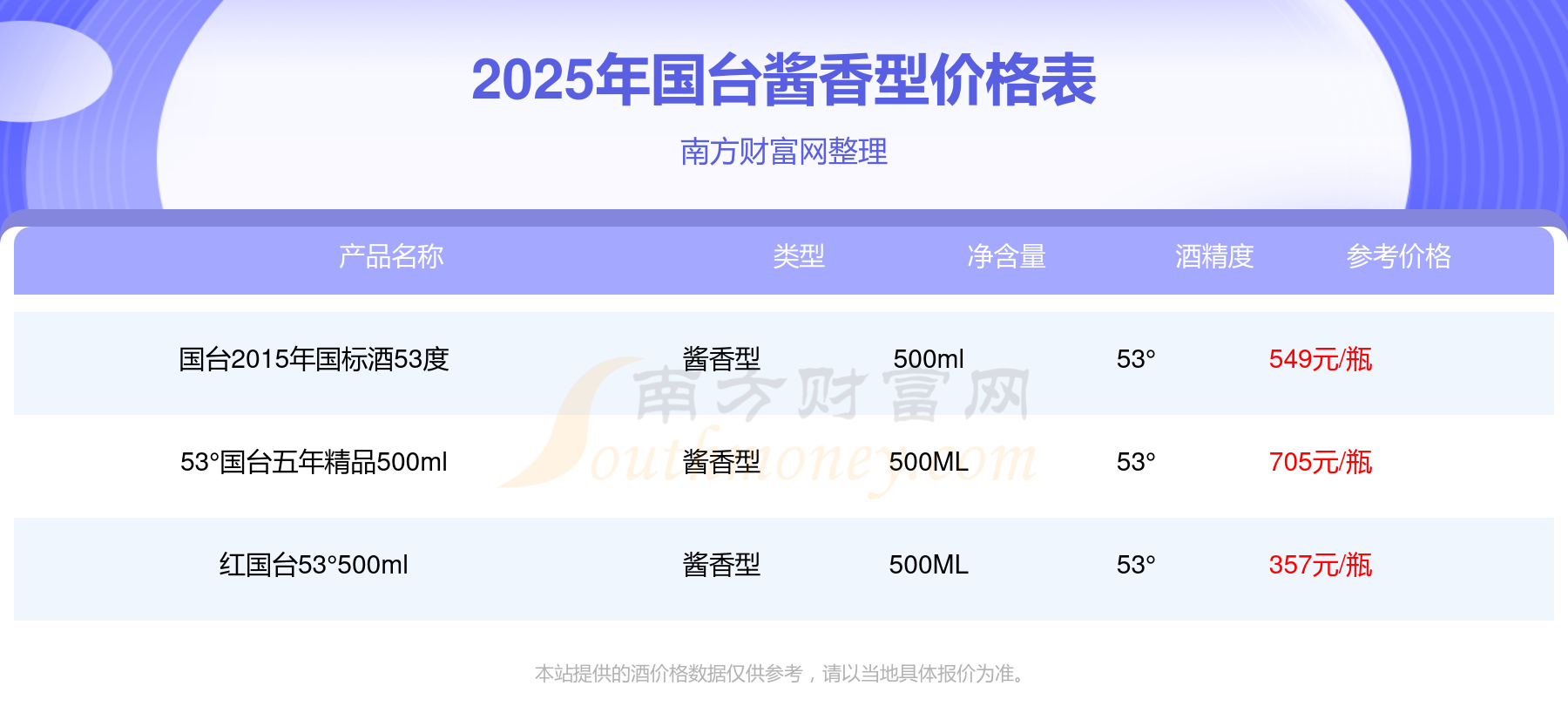 53°國臺五年精品500ml參考價705元/瓶、國臺2015年國標酒53度參考價549元/瓶、紅國臺53°500ml參考價357元/瓶。