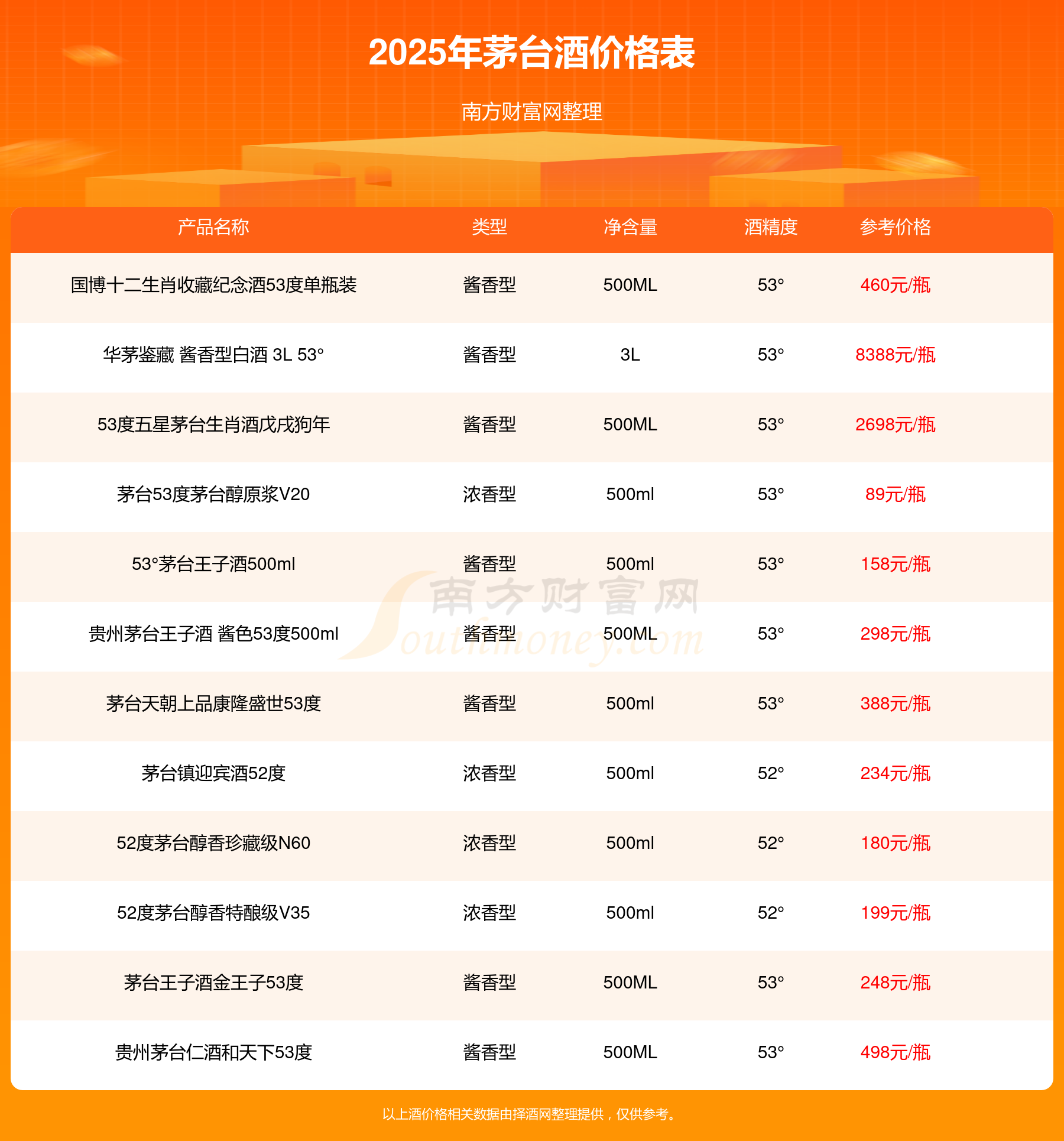 茅臺酒最新價(jià)格2025:華茅鑒藏 醬香型白酒 3L 53°參考價(jià)8388元/瓶、53度五星茅臺生肖酒丁酉雞年參考價(jià)2798元/瓶、貴州茅臺己亥豬年生肖酒53°500ml參考價(jià)2699元/瓶、53度五星茅臺生肖酒戊戌狗年參考價(jià)2698元/瓶、飛天茅臺53°500ml(2015年)參考價(jià)2199元/瓶、茅臺王子酒己亥豬年生肖紀(jì)念酒53度2.5L參考價(jià)2099元/瓶。