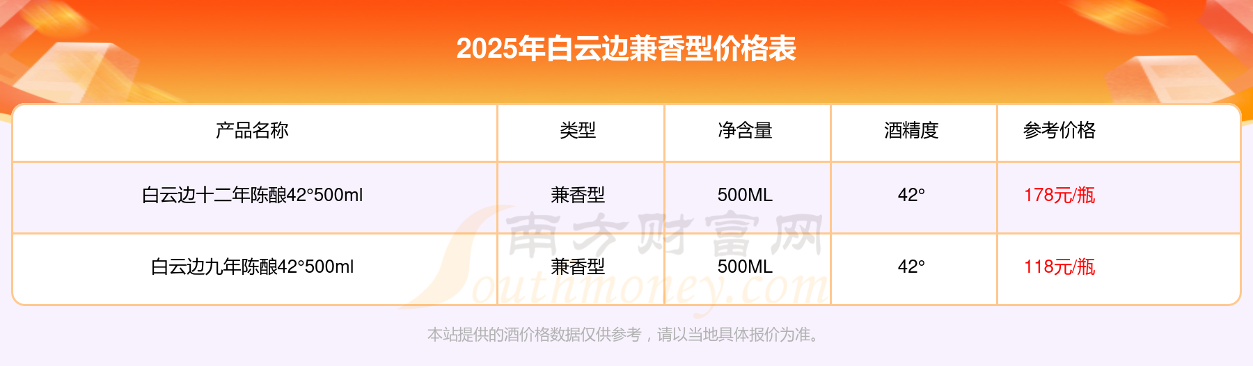 2025年白云邊兼香型價(jià)格最高的酒是白云邊十二年陳釀42°500ml,參考價(jià)178元/瓶,最低的是白云邊九年陳釀42°500ml,參考價(jià)118元/瓶,價(jià)格高低差為60元/瓶。