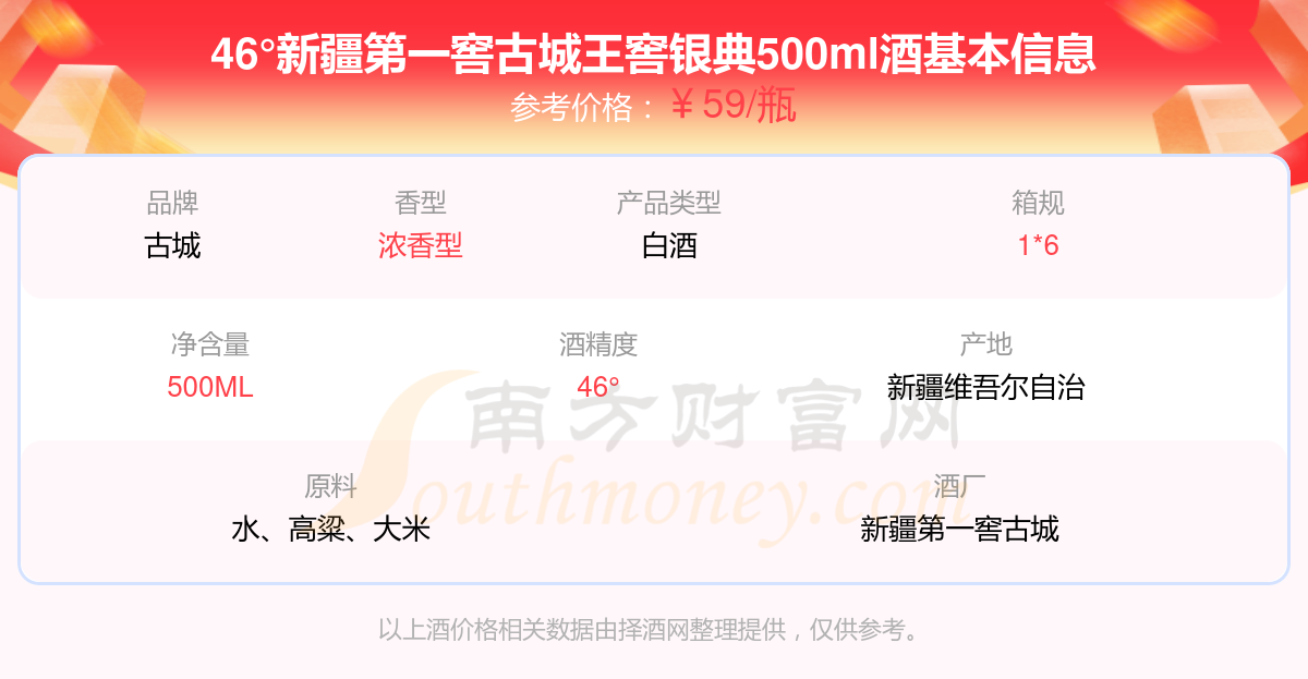 46°新疆第一窖古城王窖銀典500ml基本信息